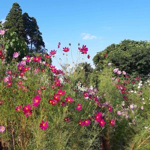 今朝のゴミ収集場所の風景🌸❤️ 零れ種からのコスモスが背高く咲いていました 今朝、雨が降った後です