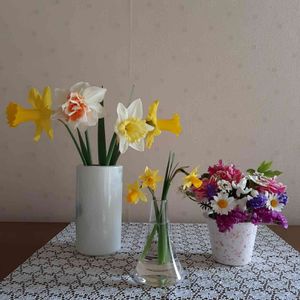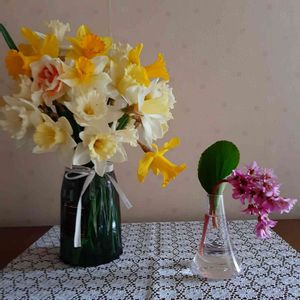 水仙を生けました😊 雨で倒れた花が元気に咲いています💛 小さい方は、ヒマラヤ雪の下です🌸 以外と持つので、これからは生花でも楽しみたいです