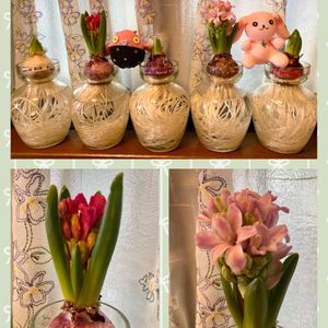 久しぶりに🏷フクロウ祭🦉に参加させて頂きます(*^o^*) 毎年恒例のヒヤシンスの水耕栽培💧 一斉に始めましたが育ち方はそれぞれです🎶 一番最初に咲いたのは薄〜いピンク色💖 次は蕾の色が濃くなってきた赤に近いピンク色です❤️ ヒヤシンスの香りがもうすぐ春だよ〜🌸を知らせてくれます╰(*´︶`*)╯♡・:*+. まつぴよさんのフクロウちゃん🦉とソクウサちゃん🐰久しぶりの登場です🎶