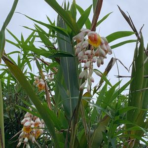 おはようございます😊 今日の天気は曇り時々 雨 ☁️☔️ 最高気温29度 最低気温26度 我が家の裏花壇より🌸🌼🌺 🌿🤍💛月桃(ゲットウ)🤍❤️🌿 今朝はどんよりと曇って☁️今にも雨が降り出しそうな天気です🌧️ うりずんの季節に花が咲きはじめた裏花壇に自生しているサンニン(月桃)🌿🤍❤️💛🌿そろそろ終盤を迎えています😓 木から垂れ下がり堤灯のような白い花を咲かせ…ラッパ状の花の中は黄色で中心から赤く筋が入っています💛❤️月桃の葉や花からは特有の良い香り〰️💕🥰白い蕾の先がほんのりピンク色🩷で可愛いですね💕😍 月桃(ゲットウ)の香り〜💕 葉で包んだムーチー(餅)大好きです💕💚🥰我が家は月桃の花は花瓶に生けて観賞用として🌿葉は細かく刻んでお茶パックなどに入れて防虫、防カビ用として使用しています💕🌿🥰🌿昨年より葉を月桃茶🍵として…アイス🧋がおすすめです🌿🌿🌿 🌿月桃の葉は沖縄では古くから邪気を払う薬草として…防菌作用があるので食べ物を包むのにも使用されて来ました🌿(化粧水、石鹸などにも)💚 🌿月桃の利用🌿 防虫、防カビ、抗菌、消臭、芳香、アロマ、化粧水、ハーブティーなど🌿🥰 🌿旧暦12月8日 🌿 ムーチー(鬼餅)の日🌿 月桃の葉で包んで蒸した餅を 旧暦の12月8日には厄払いの為に 神仏に供え家族の健康を祈願する 年中行事!無病息災☆家族の健康を願いヒヌカン(火の神)お仏壇にお供えします🌿🌿🌿 🌿•*¨*•.¸¸☆*・🤍💛❤️•*¨*•.¸¸☆*・🌿