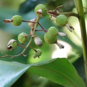 ウライゲットウの実が直径3cmくらいにまるまるってしてきてます〜🟢🟢🟢 普通のゲットウとはちょっと違って、上に向かって咲くお花の様子はタグから見てください〜🌸🩷🌸