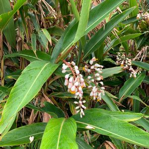 月桃(ゲットウ)。沖縄のウミカジテラスの中のハーブのお店でもエッセンシャルオイルが売られていましたが、実際に見たのは石垣島から船で小浜島に行き、レンタカーに乗っていた時でした。 去年の「石垣島&西表島」の「みどりのまとめ」に載せた、「由布島に咲く花の看板」にゲットウの花が描かれていました。去年行ったのは8月で4~6月に咲くというゲットウは、咲き終わっていました😆 今回の目標「ゲットウを見つける!!」 レンタカーで道路の左右に目を走らせていて、見つけました~🎶 大きな白い花を咲かせる。花弁は厚みがあり、蝋細工のよう。唇弁は黄色で、中央に赤い縞模様。9月 - 10月に赤い実を結ぶそう。 沖縄ハーブの王様「月桃(サンニン)」は魔除けや虫除けとして利用したり、健康・長寿祈願のために「ムーチー」という月桃の葉で包んだ餅を年に一度食する文化が現在でも受け継がれているそう。 最近では、アンチエイジング・美肌効果で話題に。ポリフェノールはワインの30倍。「錆びない肌」へ導くそう💓 150kgからスプーン2杯程度しか抽出できない貴重な精油とのこと。 ショウガ科ハナミョウガ属(アルピニア属)、常緑多年草。