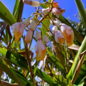 6月23日 慰霊の日 ゲットウ月桃 を 添えて 海の向こうの 故郷に 想いを馳せ 静かに 祈ります。 撮影 2023年 5/14 板橋区熱帯環境植物館 平和の祈り …………………………………………………… ゲットウ 月桃 学名 Alpinia zerumbet ショウガ科ハナミョウガ属の常緑性多年草 熱帯から亜熱帯アジアに分布 日本では沖縄県〜九州南部に分布 温室育ちのゲットウを見てきました。お花はどれも 外を向いてて 館内通路から見ると 後ろ姿や 斜め横顔ばかり… 白い蕾の先が開き 出てきた唇弁は黄色で、縁が波打ち 中央に赤い縞模様があります。 この角度では ちゃんと見えませんね〜