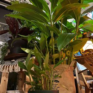 おはようございます。 朝晩過ごしやすくなってきました。サンニン(ゲットウ)の実の色も濃くなってきています🟠🟠🟠 バナナ、花と葉っぱの形が空飛ぶ恐竜みたい🦅 大型ディスカウントショップを出たところ風景です。ミニミニ ジュラシックパーク🦕🦖😆