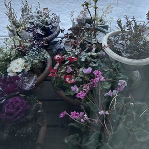 パンジービオラ✨ カラフル🌼🌸 あちこち飾って楽しんでます♪ ③~⑤今朝の庭☃️❄️ サラッと降りました🍃