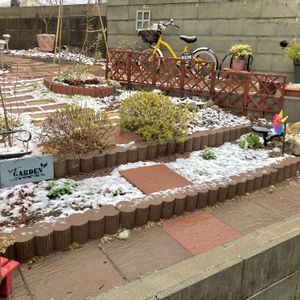雪の庭⛄ この前降った日に撮りました!✨ 手前に対で植えてある、 もうすぐ植えて丸2年くらいになるサントリーさんのミンティア🌱 夏くらいから調子が悪く、ついに写真左側の株が半分枯れ込んできてしまいました💦 原因不明なのですが、病気か、もしくはその隣に鹿沼土を使って植物を植えたので酸性が嫌だったのか…( ;∀;)💦 刈り込みに強くない品種だと思うので、残念ですが春になったら両方とも抜いて植え替えをしようと思います。 いまのところまたミンティアにする予定✨ 早く春になれ〜🌸