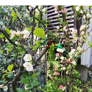 庭の一角 シリーズ ①ミッドナイトブルーと ソワリングスピリッツ何度も咲くから四季咲きのバラだと思う ②100円で買った名前のわからない 白いバラこれも何度も咲いている ③サンパラソルがまた咲いています ④四季咲きで咲き分けのボケ ⑤この時期になると目立つ万両と千両
