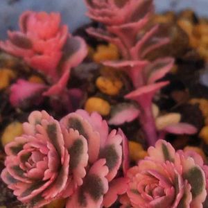 夕暮れ時の セダム ・アトランティスさん😻💛💚💗🤍 少しピンク色が戻って来たかな😻💕 雨曝しですが 流石に強いなぁ…とナデナデしたら 手触りが植物っぽくなかったです😸❓ (造花っぽかった…)←本物です😸💧