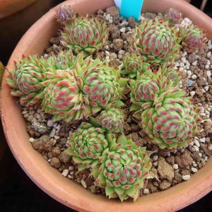 今朝はうちの温室の中でも1℃まで気温が下がっていた。昨日までほとんど色付いてなかったセンペルビウムのキィライムキスも一晩であっというまに赤い部分が増えていた。 このセンペル,うちに来て1年くらいなのによく増えて,今は4ヶ所に分けて育成中だけど,場所によって色付き方が全然違う。この季節はいろいろ見て回るのが楽しい。