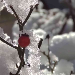 おはよう御座います☕ 昨日 午後から降り出した雪が 今朝起きたら、五cm程積もっていました😵 玄関先の ローズヒップの赤い実だけが顔を出しています🔴 🏘の後の道路はガチガチ🧊🧊 路面凍結 🚗 ₌₃ 気を付けましょう〜