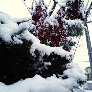 今朝、カーテンを開けてびっくり銀世界になっていました。 庭のモミジとイチイは雪で重たそうです。
