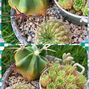 おはようございます😃 だいぶ前に百均サボテン🌵さんと センペルの子株を一つの鉢に植えたものですが、手前の子はあまり日にあてると茶色くなるのでいつも奥になる位置に置いてます今は緑で可愛く育ってますね🎵センペルさんもぎっしりで🤣可愛い😍奥のトゲすごい子も良い感じ😚なぜか姫秀麗だと思うけど、居候してる😅