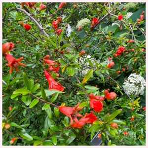 今日のお花 🌿ザクロ🌿 近くの公園にて… この花はヒメザクロ(姫柘榴) (ザクロの矮性品種) 樹高は1、5m程ですが、横に大きく広がり朱紅色の鮮やかな花を沢山つけていました♬ 姫リンゴのような実をつけます 今月もよろしくお願いします🙇♂️