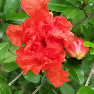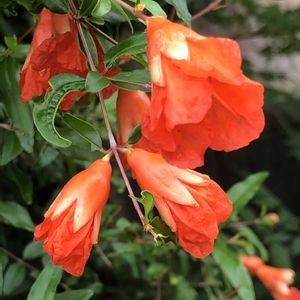 7/1㈫④ 5/1に撮りました! 神代植物公園のザクロです ヒラヒラした花びらが魅力的です ❤️🧡❤️🧡❤️🧡濃いオレンジ色ですね もう実がなり始めていました。ピカピカしてます 3枚目はタコさんウィンナーなヒメザクロ