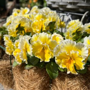 こんにちは。見ていただきありがとうございます! 2025冬の寄せ植え(バスケット) ネメシア、イベリスが満開になってきて、プリムラがその勢いに押されてます。 プリムラが溶けないで春先まで咲いているのは初めてかもです。 水捌けが大事なのかな?(昨年はブリキ鉢でした) 2枚目 待機苗のオステオスペルマム 手前はやっと見つけた、八重咲バコパの白! 3枚目 冬リースがもりもりになり、ハボタンがすっかり崩れてしまってます。かわいいけどそろそろおしまいかな。 4枚目 同居人セレクトのビオレッタ。ビオレッタ4種のうち、まとまりが良くて一番可愛い! 多肉は月兎耳(つきとじ)1年で倍の大きさに成長。寄せ植えは自信ないので単独植え。 5枚目 今年のお気に入り ビオラ「エッグタルト」もりもりしてきてかわいい。しかし早くもナメクジ被害が出てきて花びらが喰われてる(涙) ナメクジ、忌避剤はカビの原因になるので、箸で1匹ずつ摘んで除去してます。