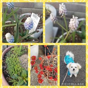 重い頭を持ち上げ スカイブルーとピンク 春を呼ぶムスカリ (🏷楽しもう2023♡) 上…ムスカリ二種類 左下…コキアと金魚草の赤ちゃん 左中…暴れる虹の玉 右下…朝散歩は冬〜のレオ