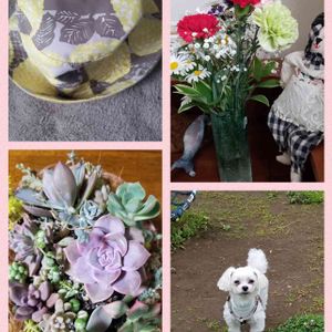カーネーションの母の日 帽子ももらいました いつもありがとうの手紙と… (上…母の日の🎁) 左下…義姉へ多肉の寄植えを… 右下…楽しい公園で レオ🐶