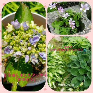 今日は☀晴れ。 明日からもう6月なのね〜。 挿し木したアジサイ可愛い色。 こんなとこからカタバミが。 ホスタ大きくなったなぁ〜