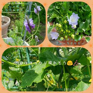 冬は越したけど元気のなかったレースラベンダー、植替えしたらようやく花芽が 沢山ついてきました。 春に蕾がたくさん付いていたものを買ったカンパニュラ・ブルーライクミー、何故か蕾が茶色くなって殆ど咲かなかったのがようやく咲いた。 もう蕾 が少ないから来年かな。😅🎶 キュウリ沢山出来てきた〜。 スーパーで春より値上がりしてるから助かるなぁ〜😆🎵
