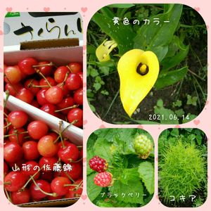 朝のうちまで降っていた雨も9時頃上がったのでまた庭仕事出来ました。 ちょっと蒸して暑かったけど…。😅💦 去年の秋に来色のカラーの球根を1個買って植えといたのだけど、春から何度見ても何にも生えて来なかったので、クサってダメになったかと思いこんで気にもしてなかった。 他の物の葉陰になって見えてなかったみたいで、今日遠目に何か黄色い物が見えてビックリ😱 3本も花が上がって来てた。 良かった〜🎶 ブラックベリーが色付き、コキアももふもふしてきた。 山形の実家がさくらんぼ農家という旦那さんのお友達から毎年送って戴く佐藤錦。 今年は不出来だと前もって電話を下さったけど、とても美味しかったです。✌️😊💕