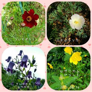 コレオプシスはこんな色の花でした。 チョコレートコスモスに似てるかな。 今大株になってるハナビシソウは元気なオレンジ色ですが、次に咲いてきたのは可愛いピンクでした。 こんな色もあったのね、初めてかも。 クレマチスはまだまだ咲いてます。 黄色のヒペリカム・ヒドコートが咲きました。 他の方が金糸梅と紹介されてるのと似てるなぁと思って調べたら、金糸梅の園芸種だそうです。 今日はユーフォルビアゴールデンシャワーに根元から新芽が出て来ていたので、花の茎を根元近くから全部切りました〜。 また花壇がスッキリしました〜。😊🎶