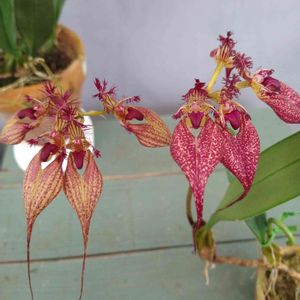 これを並べて撮りたかったのよ。 バルボフィラム ロスチャイルディアナム Bulbophyllum rothschildianum (O'Brien) J.J. Sm. (1912) ↖️元からウチにあるロスチャイルディアナム。2年ぶりの開花。昨日の朝開き始め、夜完成。 ↗️10月末に広島市植物公園で開かれた『秋の洋蘭展』の分譲・即売会で購入したばかりのご新規さんのロスチャイルディアナム。5日に開き始め、6日の朝開花完了。今日はすでに萎れ始めてることもあり、↖️との大きさの差が写真では分かりにくいが、咲き始めの実物は幅も長さも↖️より相当大きい(例えば下萼長だと↖️は8cm前後、↗️は12~13cm)。蘭展などで賞を貰うのはだいたいこっち系統。 ↗️の方は昨年の秋の洋蘭展でも、たぶん同株由来の物が展示されてて、ウチのとホントに同種か?と思うくらい、大きさから何から違ったんで、欲しいな~とは思ってたんだけど、今年、即売会でまさかの出会い→即買い🤣 で、実際こうやって実物同士を見比べると、花の色や大きさだけじゃなく、単なる個体差で済ませられないくらい色んなところの色んな形態が別種と言っていいくらい色々違う。 もし、別種だとしたらどちらが本物のロスチャイルディアナムなのか?これは後々それぞれの特徴を比較しながら検証しようと思うけど、今のところ気づいてる特徴では新参者↗️の方が本物に近いと思う。元々ウチに居たの↖️は交配種の可能性すらあるような…。 まあ、片方が突然変異個体という可能性もあるんで、どんなに違いがあったとしても市場で流通しているもの1個体ずつ見比べて、別種かどうか断言まではできないんだけど。