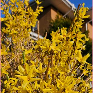 今日のお花レンギョウ グッドタイミングで満開を迎えました💛 今ちょうど西日が当たって煌めいています✨ 2枚めはレンギョウのアップ🏵