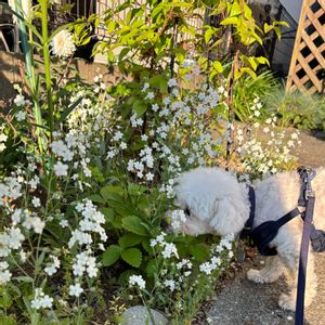 なんちゃってホワイトガーデン♡ 最近お庭の手入れをする余裕なし 零れ種とか、宿根草に救われる庭です むーちゃんは、ワイルドストロベリーに夢中🍓また青い実だけどね。
