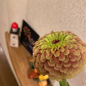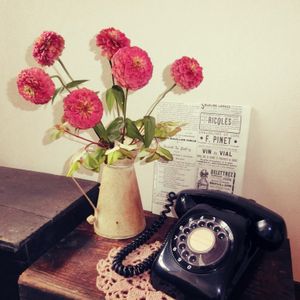 百日草クイーンレッドライム、夏の間ずっと庭を彩ってくれました😄 そろそろ終わりが近づいて、チョッキンして昔の電話と部屋に飾りました💗