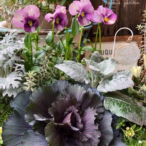 おはようございます☀ 11月から植えっぱなしのシック葉牡丹メインの寄せ植え💟 ビオラの整列が愛らしいです🌸💕 今日も素敵な一日となりますように😊