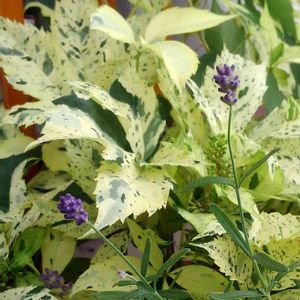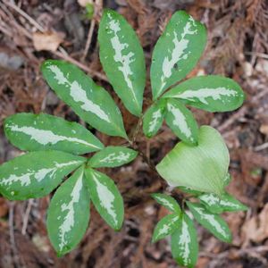 斑入りの可愛い葉っぱ発見! 「ビューティフルサンデー」 サトイモ科テンナンショウ属の(多年草)有毒植物 花の背が低く、葉っぱの下に隠れてます。 葉柄は、やはり!マムシ模様です。 葉っぱの配置がシンメトリーで、美しいです。
