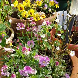 おはようございます🌼 朝日に玄関横 秋植えビオラ達が咲きそろってきました🌼🌼🌼 今日も春を感じて良い1日を🌼🌼🌼🌼🌼🌼(*˘︶˘*).。.:*♡