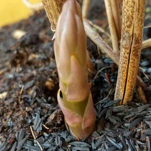 アスパラガス🥒🥦🥕🍆🍅 昨年使わなくなった漬け物桶に穴を開けて初めて植えました😊 これはもしかして食べれる太さ🙌🤗 もう一つ出ていたのにポッキリ😨😱もったいないよ。