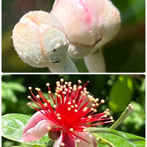 【フェイジョア】《フトモモ科》 花言葉 「情熱に燃える心」「満ち足りた」 「実りある人生」 別名 パイナップルグアバ 花の色は、白や赤です。 花弁は、外側が白で、内側が赤のきれいな花をしています。 花の中心には、赤い雄しべがあるのが特徴で、花弁よりも雄しべのほうが目立ちます。 フェイジョアの果実は青梅のような見た目をしています。 果実は夏に実り、生食が可能です。 パイナップルに似た香りが楽しめます。 フェイジョアはキウイフルーツのようにスプーンですくって食べられます。 他にも、赤ワインで煮込むことでコンポートにして食べることもありますが、あまり日本ではしません。 フェイジョアはカリウム、ビタミンC、食物繊維が豊富な果実です。 カリウムは老廃物の排出によいと言われていますので、むくみ予防にも効果的です。 ビタミンCが豊富なことから、肌にもよいとされています。 食物繊維が含まれています。 2022.6.4