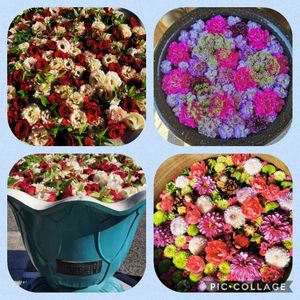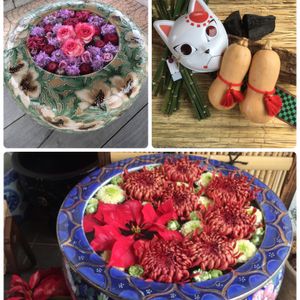 最明寺の花手水💐 キク バラ ポインセチア カーネーション スカビオサ アストランティア 上段右 炭治郎の耳飾りを付けた厄除の面等の鬼滅グッズ 上段左 休憩所の花手水 下段 寺務所前の花手水 埼玉県川越市小ヶ谷 最明寺