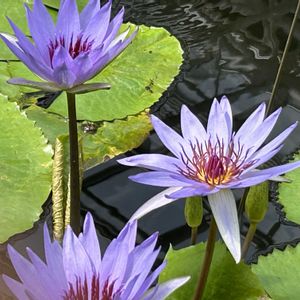 神代植物園🆕品種🪷 ウッズブルーゴッデス(昼咲種)N. Wood's Blue Goddess。 花は片親のコロラータ(原種)と似た感じではありますが、花弁のブルーが濃く、花弁数も多いため、雰囲気はかなり異なって見えます。株の雰囲気、特に葉はもう片親のアンプラ(原種)に非常によく似ています。葉はグリーンで、表裏共に模様等はありません。 感想〜神代にコロラータはありますよ!隣にいるので大きさ比べて下さい!明らかにデカいです。おススメ理由😅⁉️こんなんもあっても良いかと!笑 古き良き時代の品種🪷です🤭