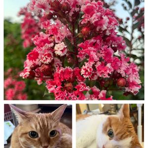 今朝のウォーキングコースにて。 ① サルスベリ まだ背の低い木でしたが、お花がたくさん❗️ ② ショウジョウソウ ③ オニユリ ④ ヒルザキツキミソウ ⑤ 変わり咲きのオシロイバナ そして今日は月に一度のお楽しみ〜💕 ニャンニャン祭り〜😻🐈🐱 先月はすっかり忘れてしまい、数日経ってから気づきました😖 この暑さでチャコもミーニャンもひたすらゴロゴロダラダラ しています😅