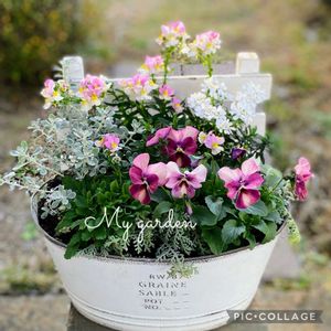 寄せ植え苦手な私の寄せ植え😅 うえたさんのパンビオ、フリフリのマリーリーンとスィートラブちゃんが可愛いです💗 白いイベリスブライダルブーケ🤍とリーフはリシマキアペルシャンチョコレートです🤎