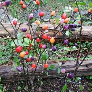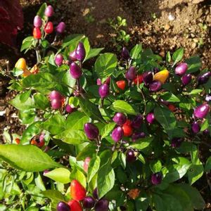 ゴシキトウガラシ・ブラックパール (横浜イングリッシュガーデンにて) 初めて見た時は黒い実と、葉にビックリ👀!!、一呼吸置いてから、輝くブラックパールが美しく、オシャレだと思いました。 自然にある色ではありませんからね。 葉は緑色から徐々に美しい黒葉になり、黒葉に紫の花が咲き、やがてその実は紫~黒紫~赤へ変化するそうです。 最近行った里山ガーデンにもブラックパールがあり、黒の実に赤の実が少し混じっていて、それも綺麗でした。見学の方達が黒の実と葉を見て、ビックリしていたので、お節介にもブラックパールという名を教えたくなりました😆 ピッタリな名前ですものね🎶 ちなみに7/5にup した家のカラフルなゴシキトウガラシは、熟したら一株がオレンジに、もう一株は赤が多くなってきました。不思議???