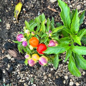 ❁.。ゴシキトウガラシ。.❁ ハロウィンを先取り!🎃👻🍭 観賞用のゴシキトウガラシです🌶 紫と黄色のハロウィンカラーで、 色変わりの容姿が楽しめます✨ ダークなリーフも魅力的ですよね🦇*✩ 冬ごろまで楽しめるので、 お部屋の装飾や寄せ植えや花壇など ぜひ取り入れてみてください🌱 *育て方* 日当たりの良い場所を好みます☀️ 水やりは土の表面が乾いたらあげてください🌿