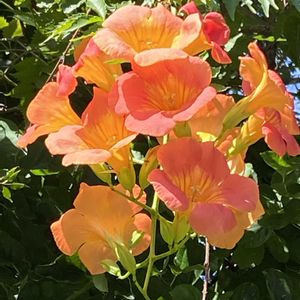 おはようございます♪ 涼しい朝です〜 咲遅れた ノウゼンカヅラ 薄陽を浴びて輝いて見えました〜