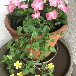 赤に 、白に、ピンクと 毎年 夏の花 日々草には お世話になりますが、今年は こんな桃色 を 買ってみました ❣️ ( 桃の ときめき ) 2株 に、足元 垂れ下がる 黄色い小花🌼を 付け加えてみました。 ジャメスブリタニア とか、4色あるうちの 黄色 🌼 初めて栽培するので、全く 分からないお花🌼です。 うまく育つか? 全く 分かりません 。。