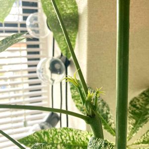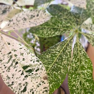 実生のパキラを探していて、ホームセンターで ポトスやアイビーと一緒に4本ほど植えてある物を見付けました🪴 その中の10㎝程の小さなパキラの葉っぱに斑入りの物がありました🌿 1番上の葉はうっすらと出てる感じですが、下の方は割と斑が入ってました☺️ 実生の斑入りは貴重なので大事に育てたいと思います🥰