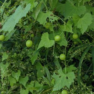 スズメウリ ウリ科 スズメウリ属 今日の里山お散歩でスズメウリの可愛い果実を見つけました🟢🟢🟢 下の方の小さな小さなお花はアカネの花です。