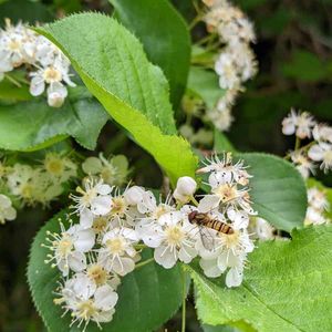 カマツカ 別名 ウシゴロシ バラ科 カマツカ属 里山お散歩👣 カマツカのお花が咲いていました🤍 ホソヒラタアブがお花の蜜を吸っていました🐝 赤い実がなるのが楽しみです♥
