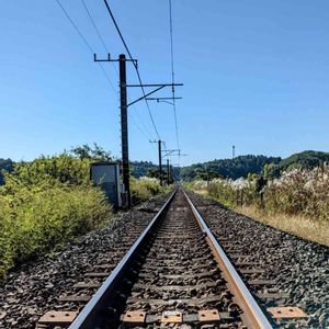 秋晴れですネ〜♪ 里山お散歩の途中には まっすぐ続く線路があります。 🎼 線路は続くよ どこまでも〜 なんて歌いたくなります🎶 線路沿いにはオギやセイタカアワダチソウが見えます🌾 ここは撮り鉄さんたちが時々 写真を撮りにきます📷