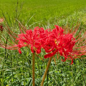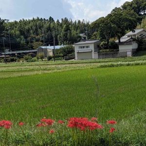 今日のお花♪ ヒガンバナ ヒガンバナ科 ヒガンバナ属 田んぼの畦道に咲くヒガンバナです♥ 背景は稲刈りが終わった田んぼです🌾🌾🌾