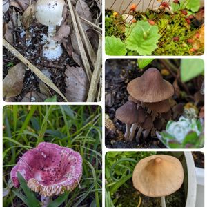 里山お散歩とウチのプランターに生えたキノコ🍄と苔です。 左側の2枚が里山お散歩で見つけた白いキノコと紫色のキノコ🍄🍄 右側の3枚はウチのプランターに生えた苔とキノコです。 苔の胞子体がカラフルで可愛い❤🧡💛💚 茶色のキノコとベージュのキノコは脚が細いです🦵