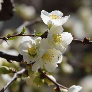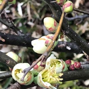 妖精の輝き 木瓜の花言葉です。 梅にも負けない美しい白い木瓜の花 美しい花に鋭い棘、 この棘は何から身を守るのでしょうか