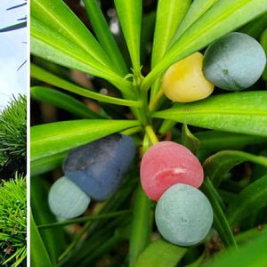 イヌマキ(犬槙) 生垣としてよく見る庭木 丸い緑色の部分は種、有毒。 種の後ろにある花托は💛→❤️→💜に熟し、暗紫色の花托を食べて見ました。 ライチのような食感、ほんのり甘い😋 ーーーーーーーーーーーーーーーーーー 🗒️ 雌雄異株 雌花は10月ごろに成熟し、 先端に緑色で白い粉をまとったようなタネができ、タネの下には卵形に肥大して暗紫色に熟した花托(かたく)が見られます。 この花托は多汁の肉質で、甘く生食できます。